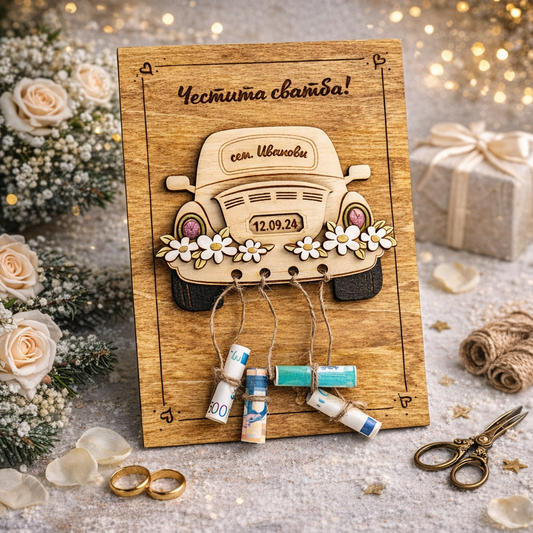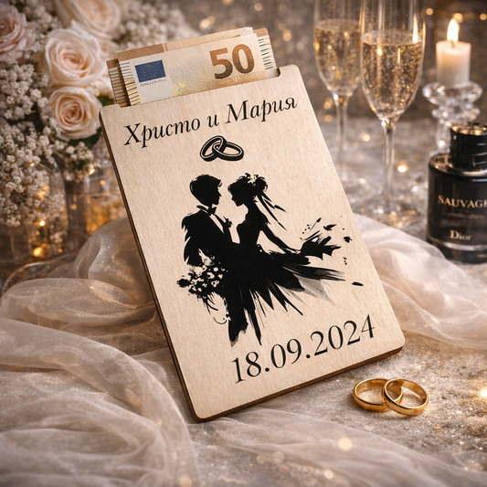 ΠΠ΅ΡΡΠΎΠ½Π°Π»ΠΈΠ·ΠΈΡΠ°Π½Π° Π΄ΡΡΠ²Π΅Π½Π° ΠΊΠ°ΡΡΠΈΡΠΊΠ° Π·Π° ΡΠ²Π°ΡΠ±Π° β βJust Marriedβ Ρ ΠΌΡΡΡΠΎ Π·Π° ΠΏΠ°ΡΠΈΡΠ΅Π½ ΠΏΠΎΠ΄Π°ΡΡΠΊ