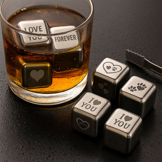 Персонализирани метални ледени кубчета за уиски – комплект от 4 | Подарък за мъж 2025