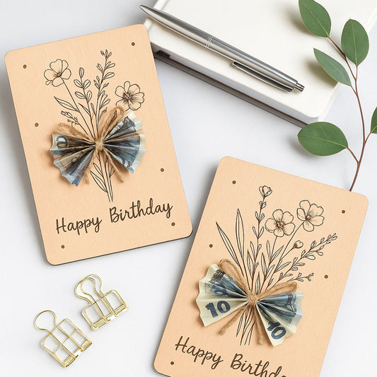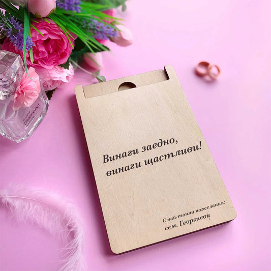 Дървена картичка с панделка от пари – Луксозен подарък за рожден ден с гравирано послание