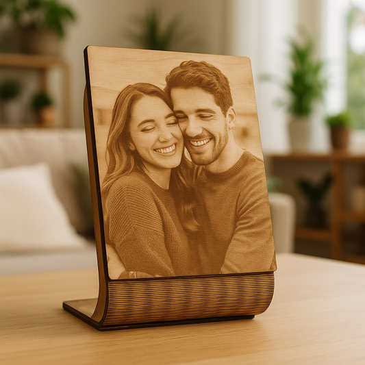 Гравирана Снимка върху Дърво със Стилна Ръчно Изработена Дървена Стойка