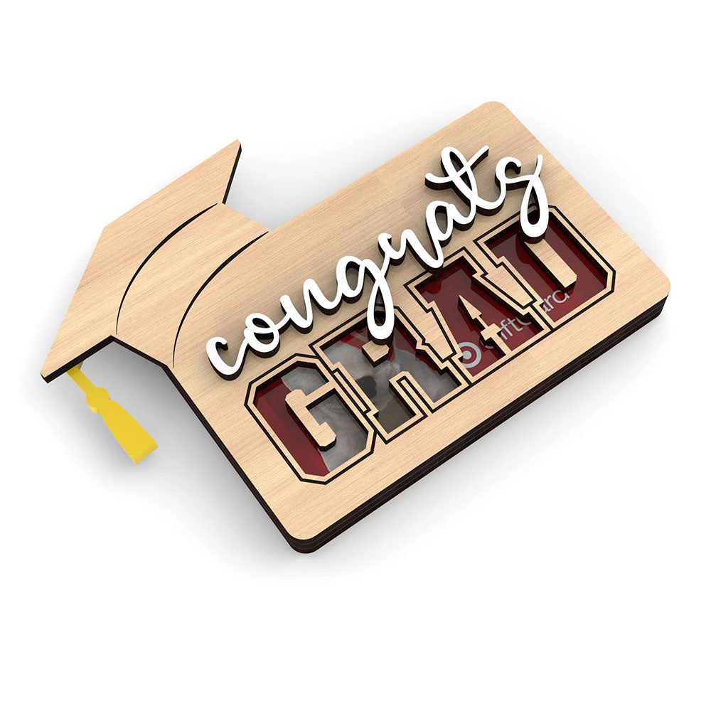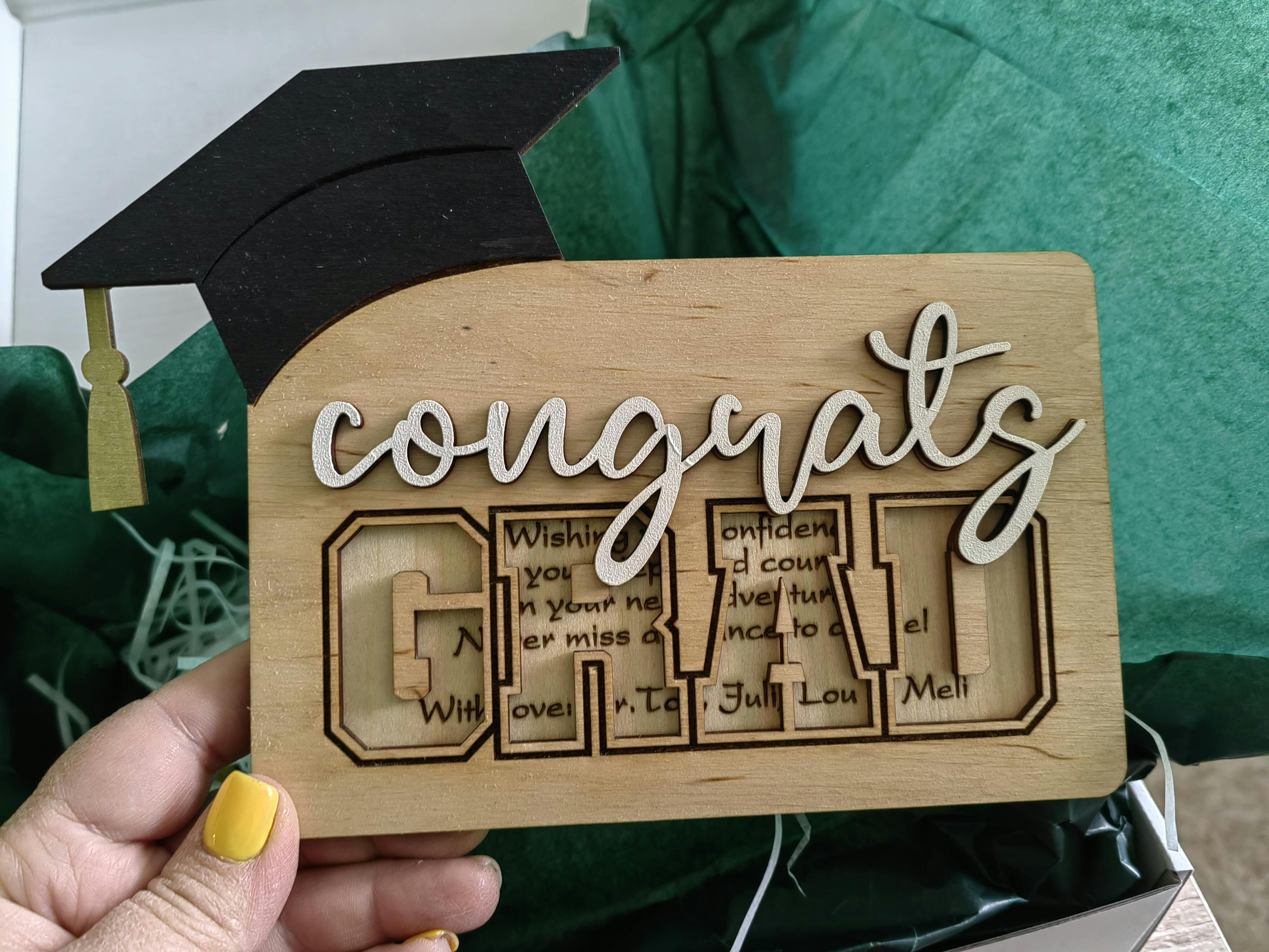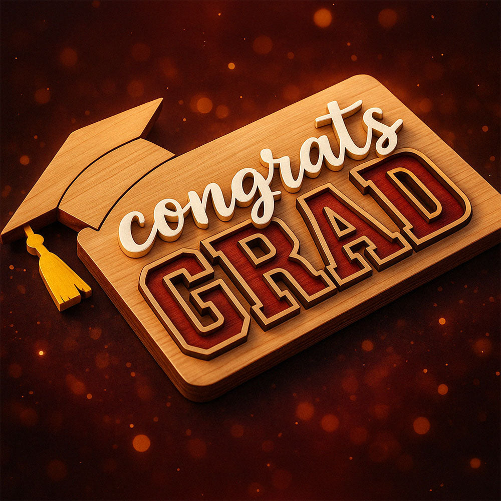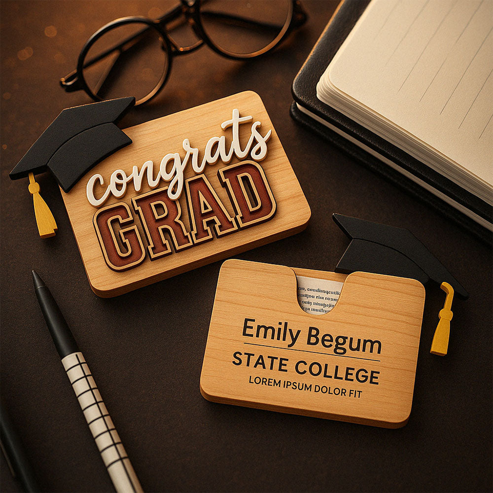 Празнувай дипломирането със стилен и запомнящ се подарък! Този елегантен дървен аксесоар съчетава поздравително послание „Congrats GRAD“ с прецизна лазерна изработка и забавен акцент – академична шапка с пискюл. В задната част има специално отделение, където можеш да поставиш пари, ваучер или малка картичка. Идеален избор за оригинален подарък, който впечатлява и остава като спомен.
