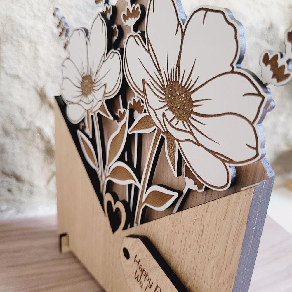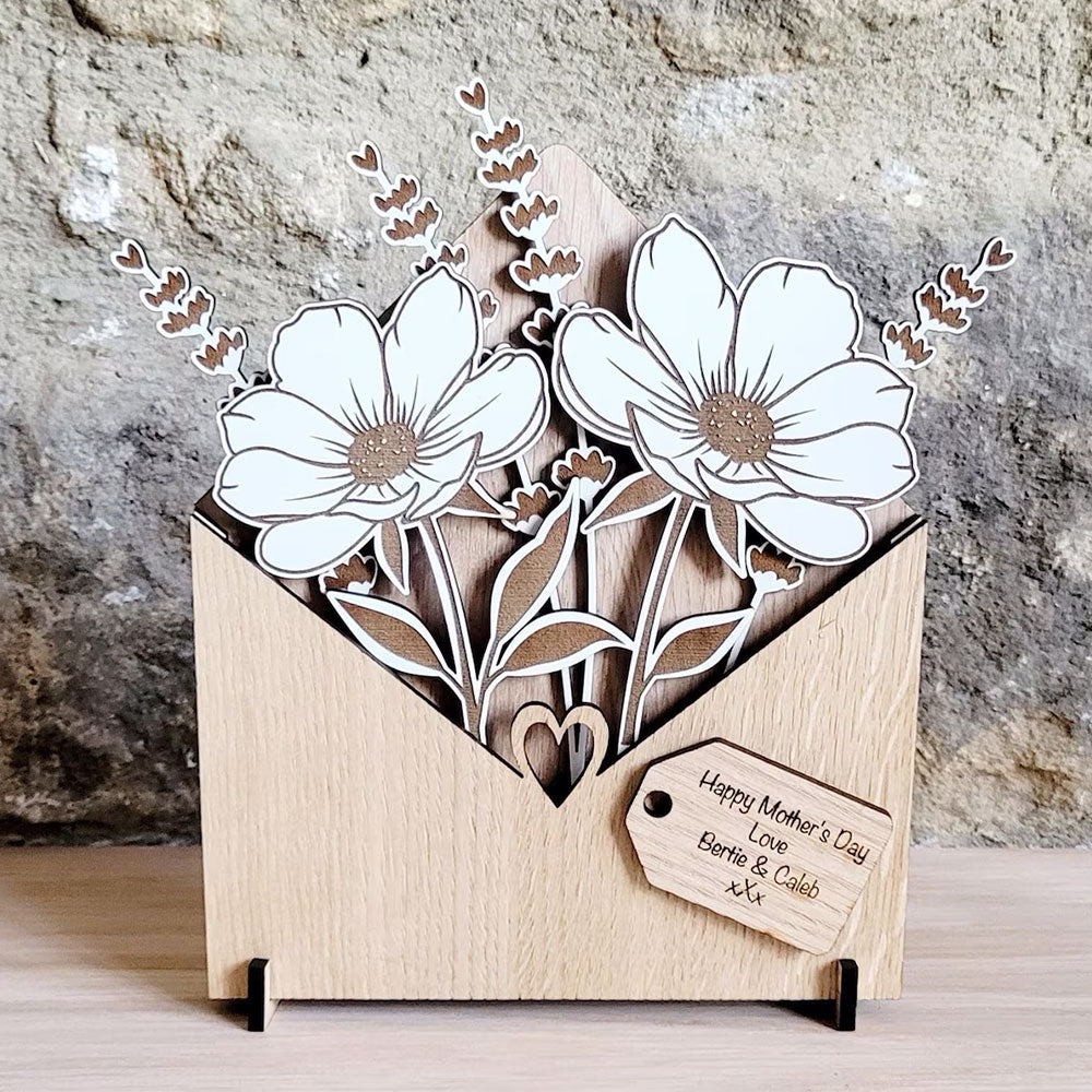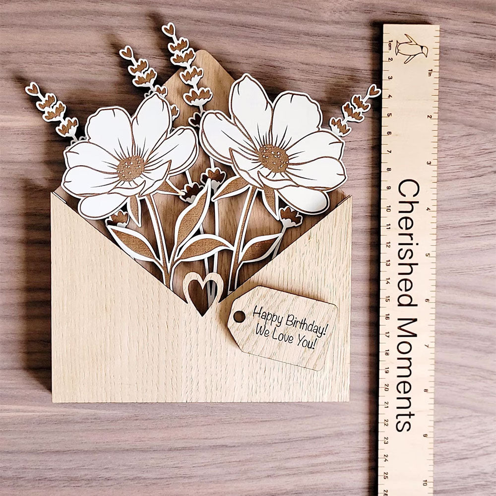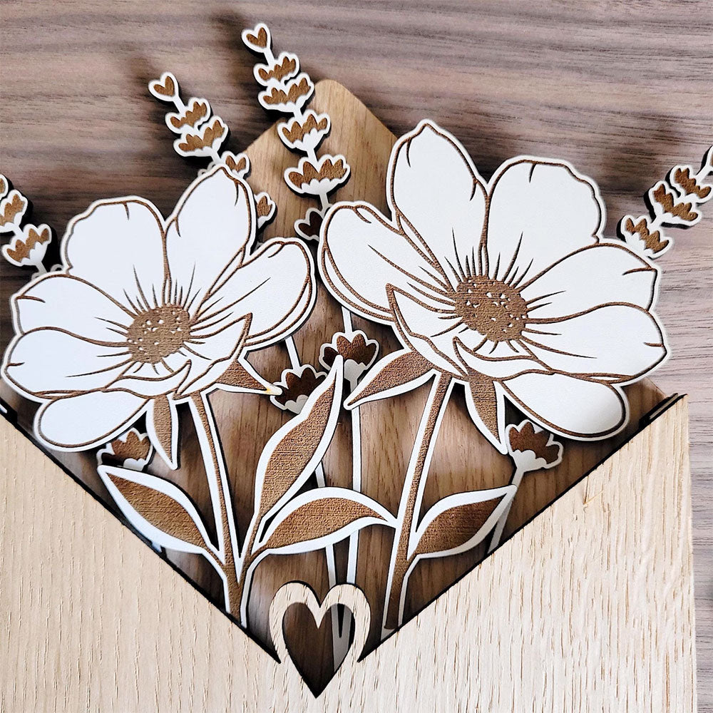 Елегантна дървена картичка под формата на плик, пълен с фини цветя. Изработена от естествено дърво с лазерно изрязани детайли и акценти в бяло. Идеален подарък за рожден ден, Деня на майката или специален повод.