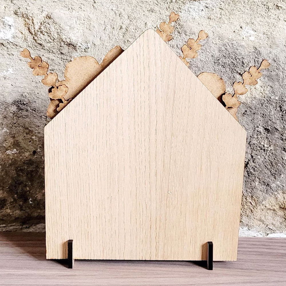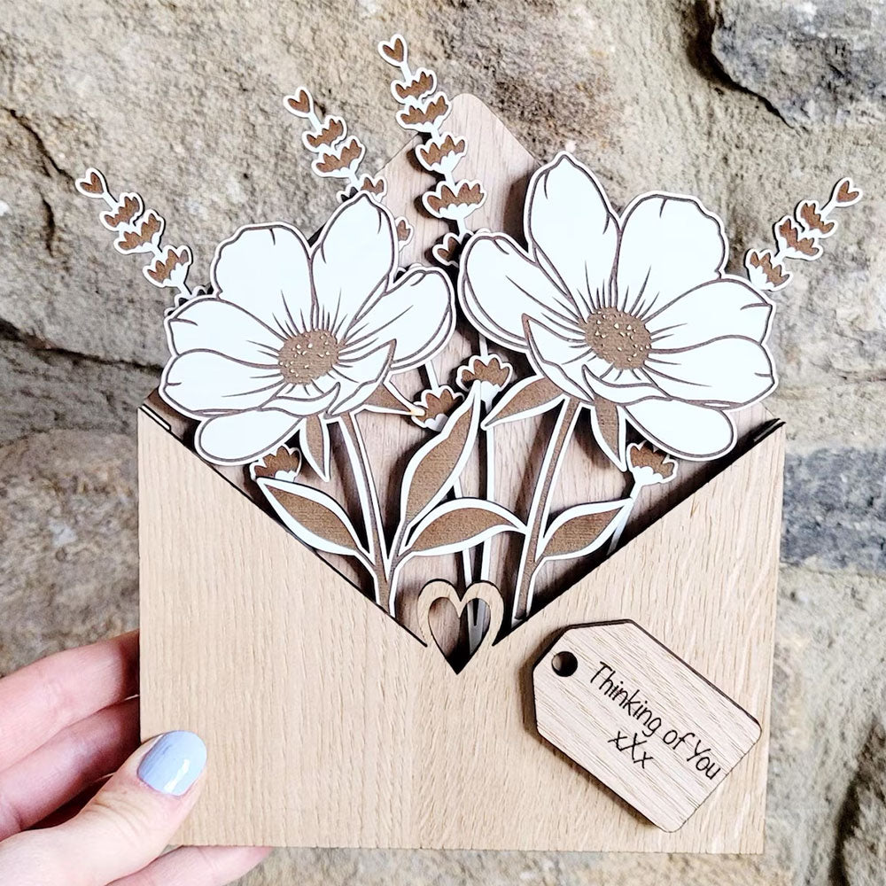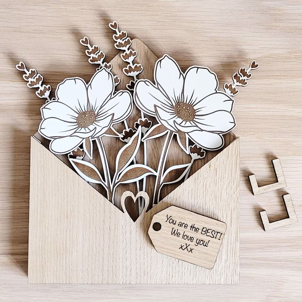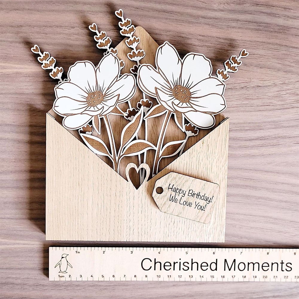 Елегантна дървена картичка под формата на плик, пълен с фини цветя. Изработена от естествено дърво с лазерно изрязани детайли и акценти в бяло. Идеален подарък за рожден ден, Деня на майката или специален повод.