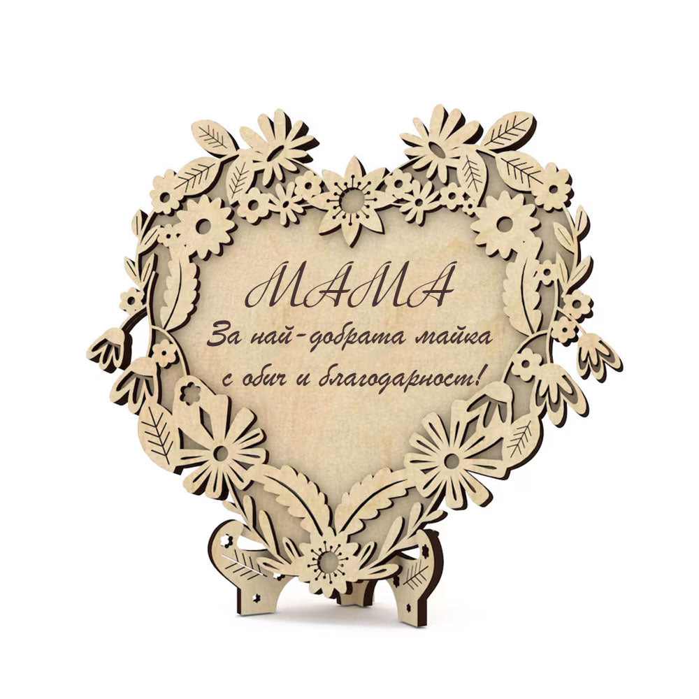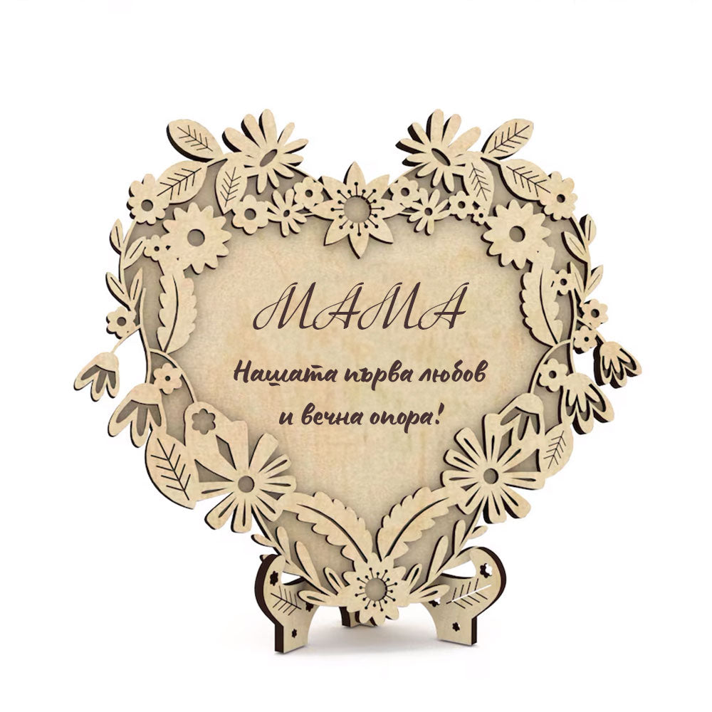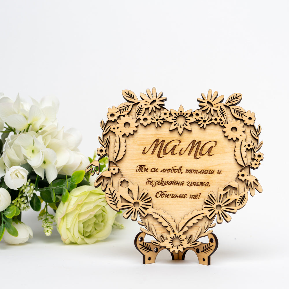 Поднесете неповторим подарък за най-специалната жена – вашата майка! Това елегантно дървено сърце, обгърнато с фини лазерно изрязани цветя, символизира безкрайната любов и грижа, която една майка дарява.