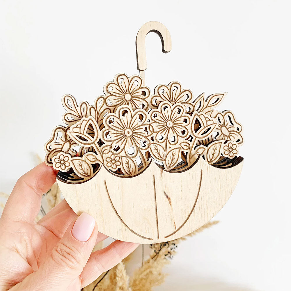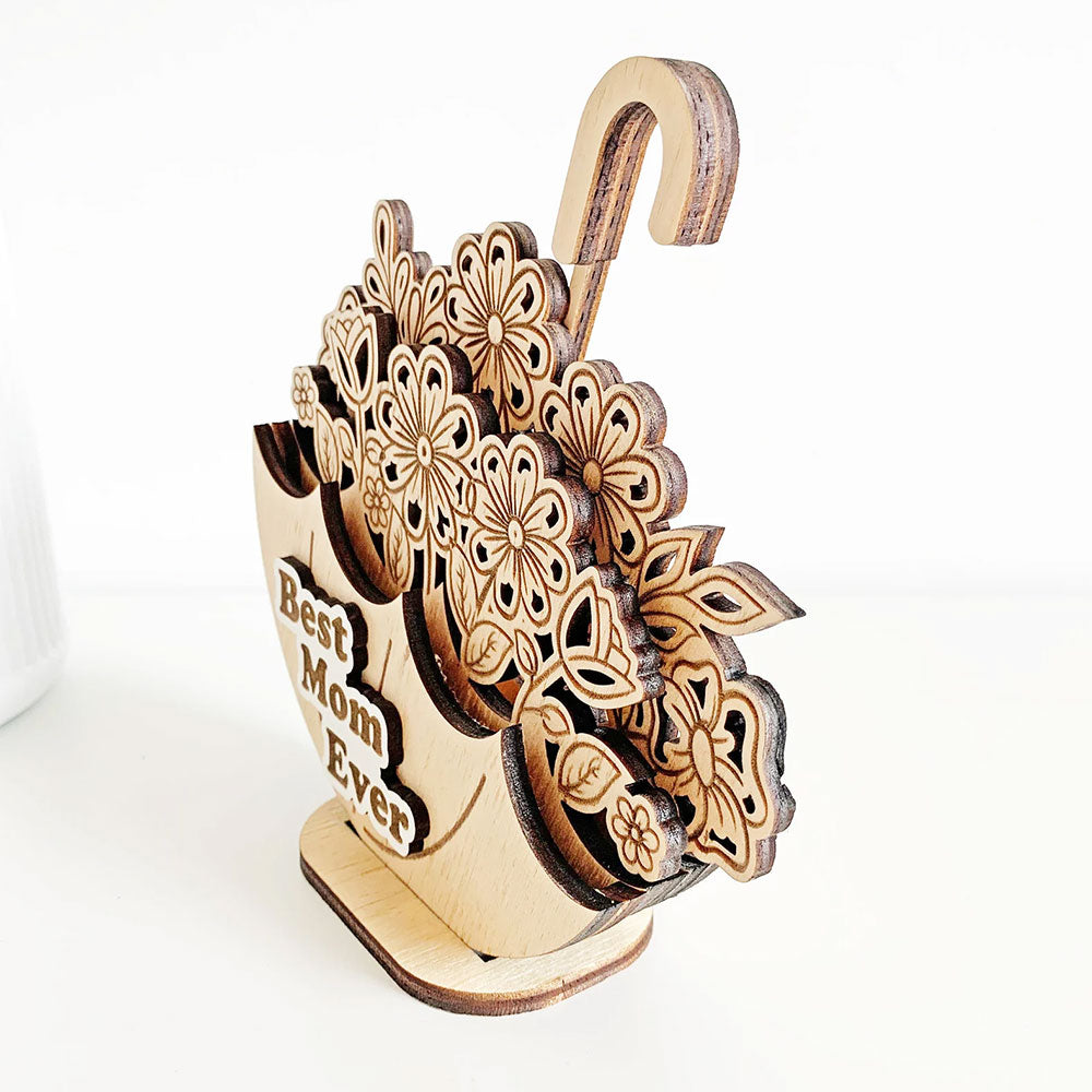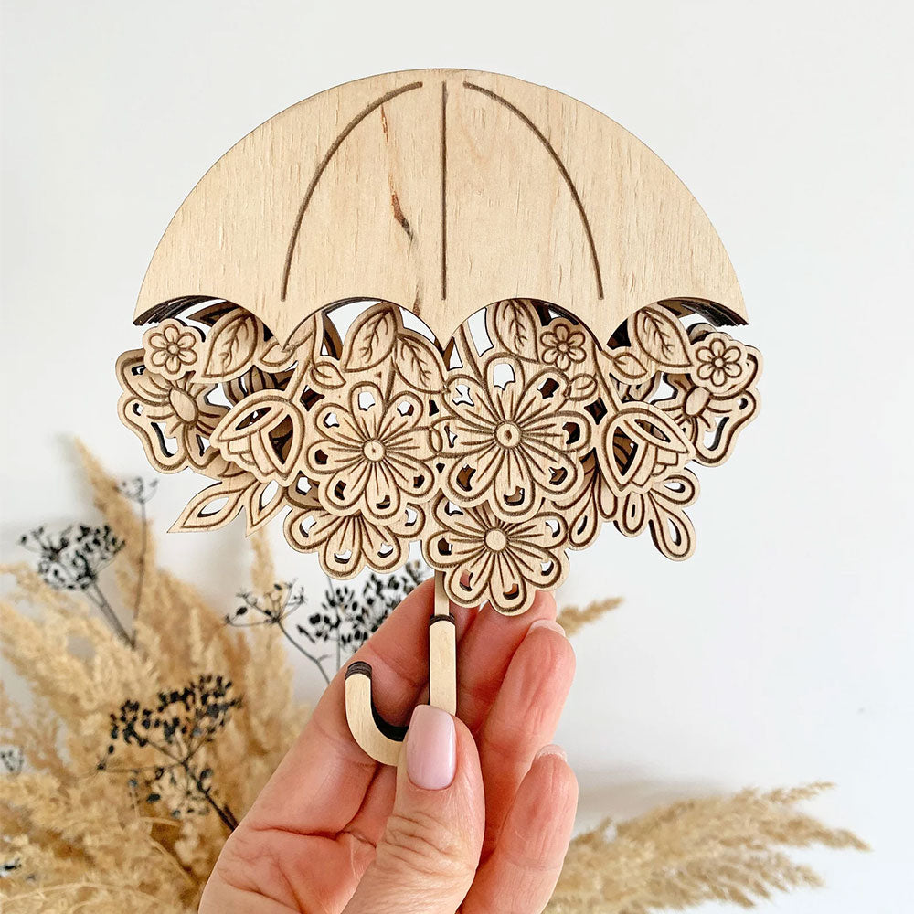 Изразете своята любов и благодарност към най-важната жена в живота си с този уникален дървен подарък! Фините лазерно изрязани цветя, подредени в стилен чадър, символизират грижата, топлината и обичта на майката.