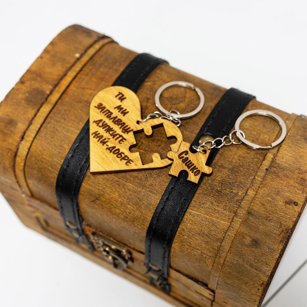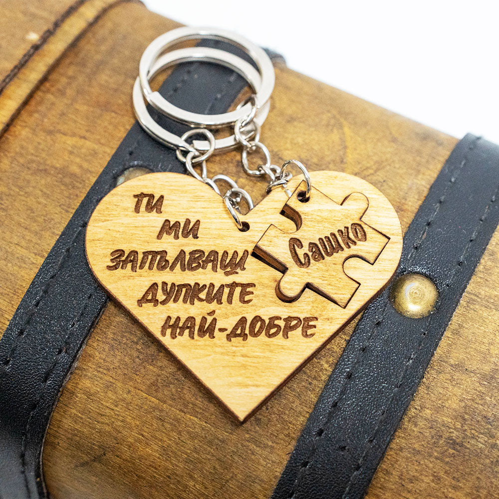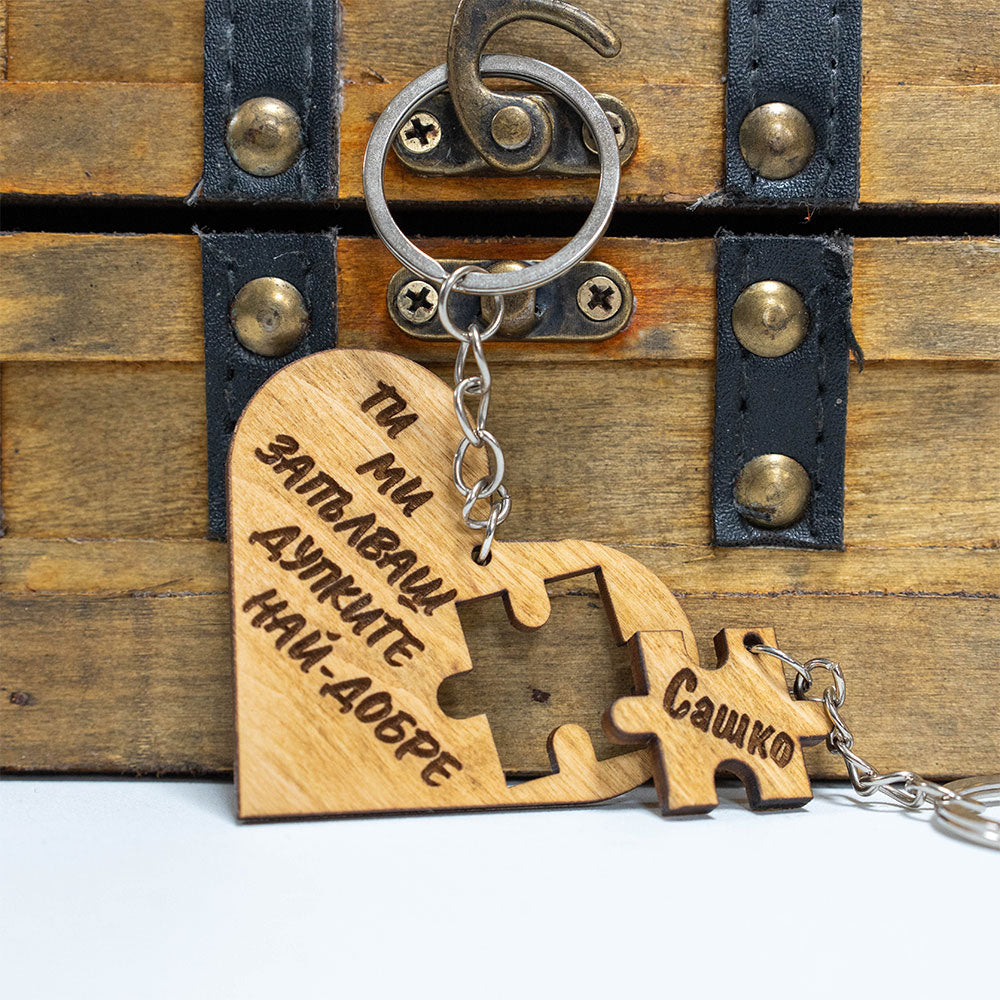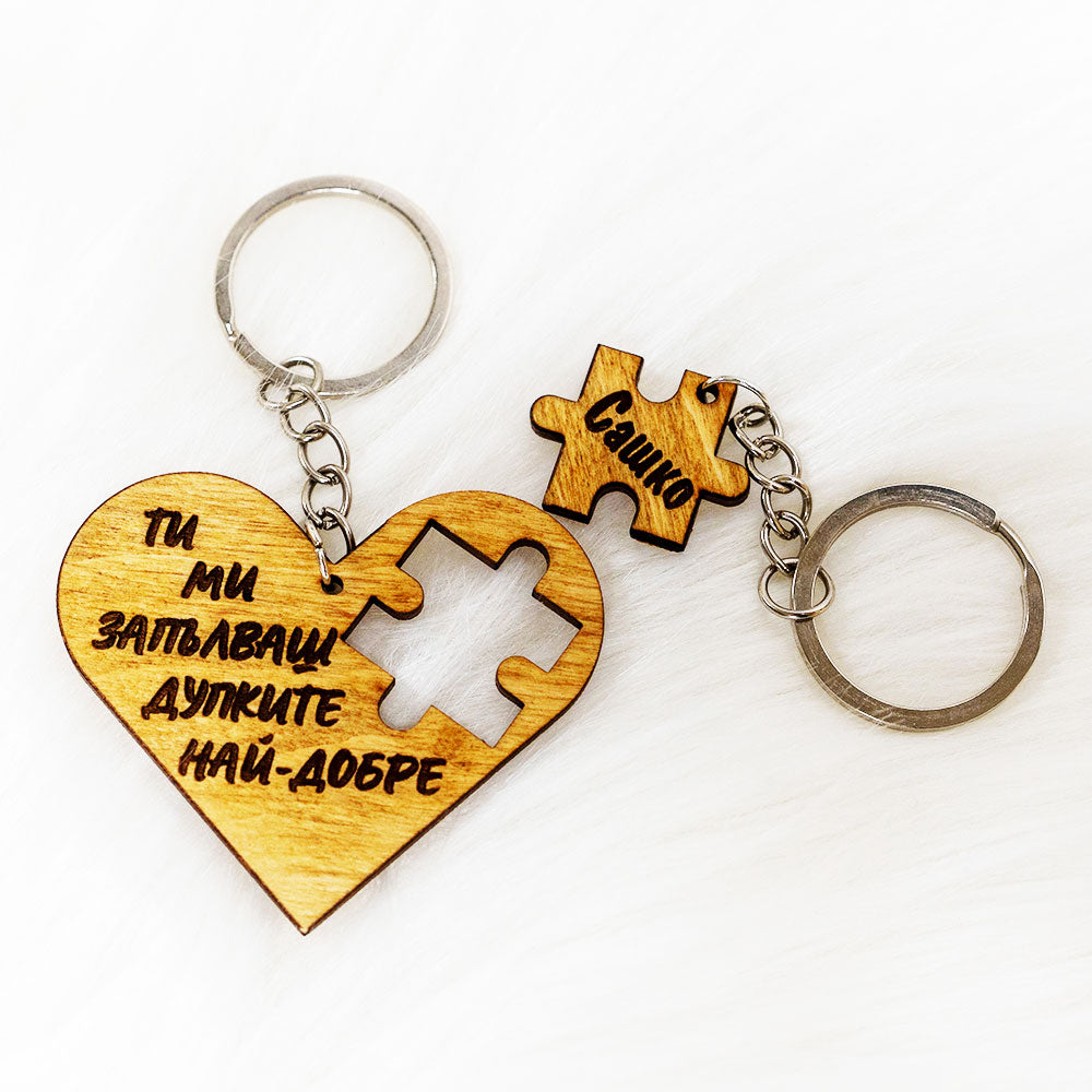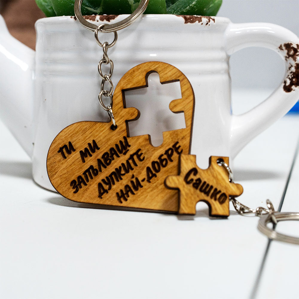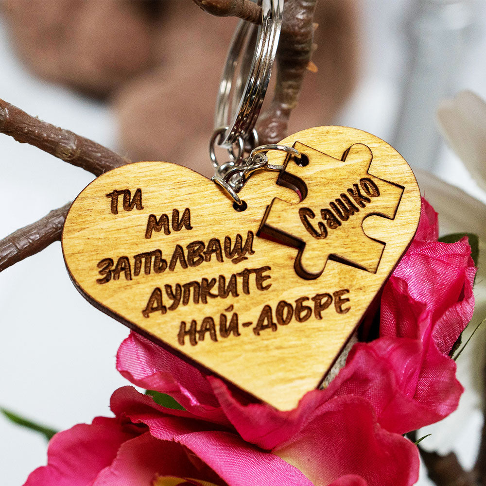Искате да изненадате своя партньор с нещо забавно и палаво? Нашият персонализиран дървен ключодържател във формата на пъзел е идеалният избор! Този уникален ключодържател включва две части – сърце с изрязано пъзелно парче и самото пъзелно парче, което пасва перфектно.